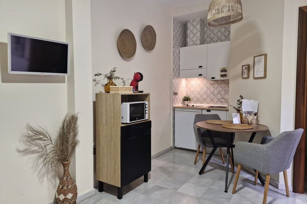 El estudio dispone de una cocina privada totalmente equipada con fogones, nevera, microondas y todos los utensilios que puedas necesitar. Además, para tu comodidad, cuenta con aire acondicionado y calefacción para que te sientas a gusto en cualquier temporada.