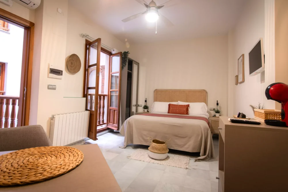 Bienvenido a nuestro Estudio Superior, un espacio de 25 m² diseñado para ofrecerte un oasis de paz en el bullicioso centro de Granada. Perfecto para una pareja o un viajero individual, este estudio combina funcionalidad y un diseño acogedor, con el añadido de un encantador patio privado para tus momentos de relax.