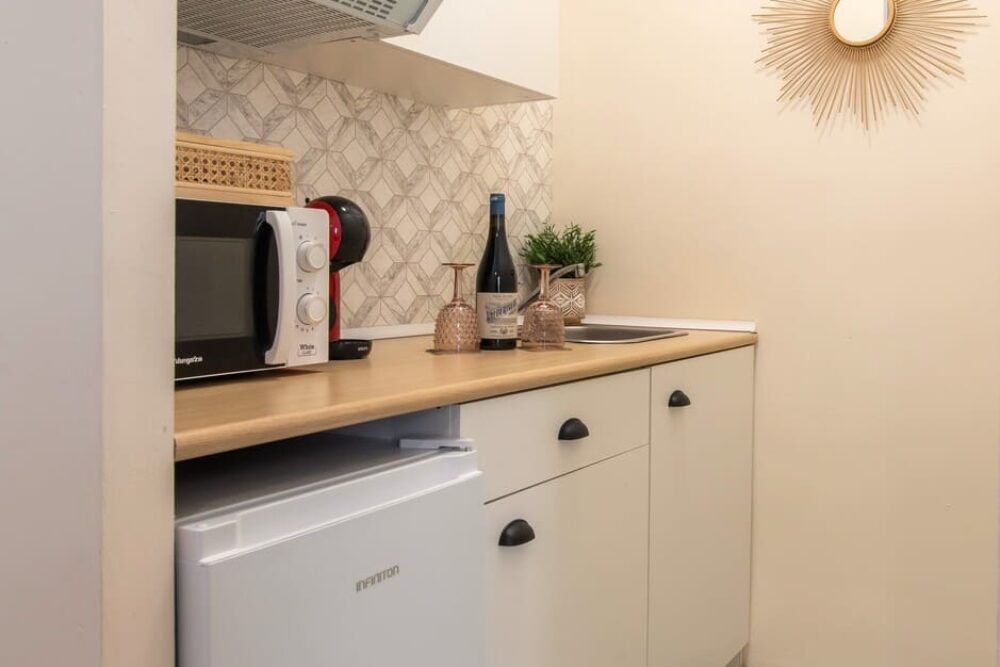 Una de las mayores ventajas de este estudio es su cocina totalmente equipada. ¿Te apetece prepararte un desayuno rápido antes de salir a explorar o disfrutar de una cena tranquila después de un largo día?